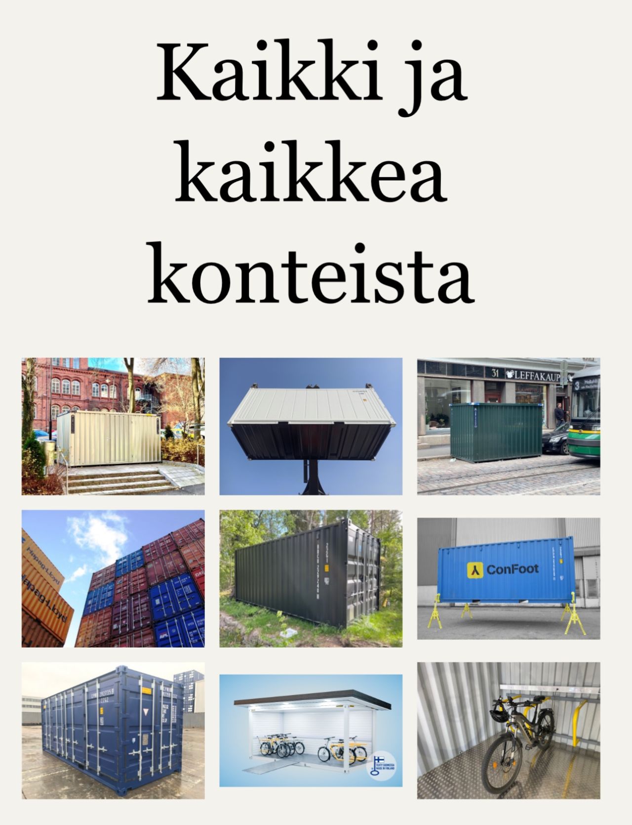 Teemme uutta ilmettä ja elämää merikonteille. Konttien varustelu on tänä päivänä erittäin suosittua. Tervetuloa Tampereelle keskustelemaan miten kontit voisivat palvella teitä.